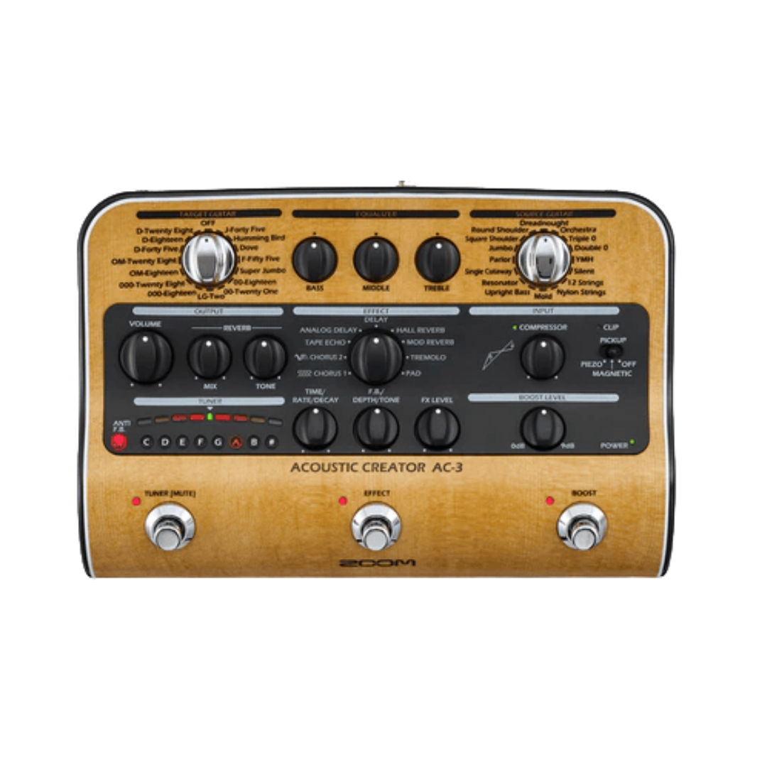 Tanto si rasga con suavidad como si toca con un poco más de intensidad, el compresor de un único knob del AC-3 es uno de los mejores que habrá escuchado nunca. El compresor de un único knob de Zoom facilita el suavizar y controlar la dinámica de su guitarra para conseguir un sonido pleno y equilibrado. Además, el indicador de LED del compresor facilita ajustar los parámetros de dinámica durante una actuación en directo.