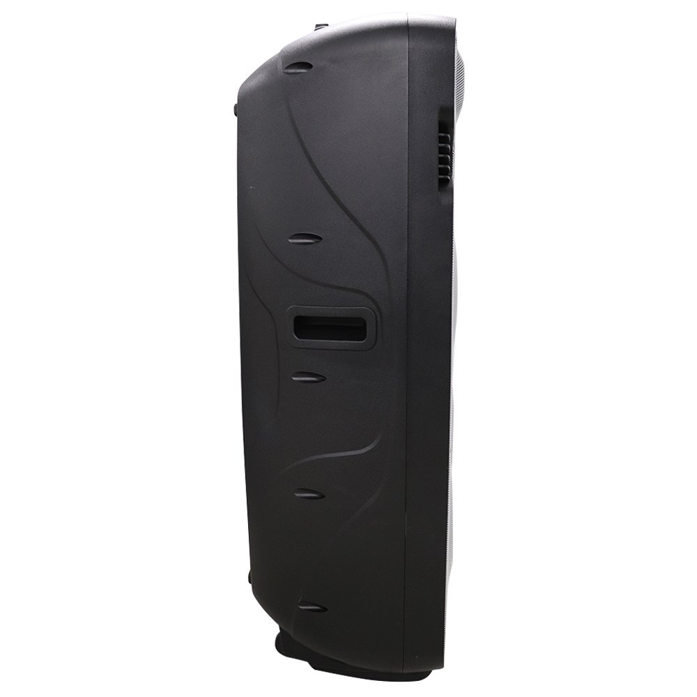 Cabina activa doble amplificada de dos vías, incorpora reproductor de formato MP3, WMA y WAV, lector de memoria SD, USB y sistema Bluetooth, posee una potencia insuperable, entrada de micrófono alámbrico 6.5mm o XLR cannon, línea de entrada auxiliar RCA, línea de entrada XLR hembra (mixer), línea de salida XLR macho (bocina pasiva 8 ohm), iluminación LED frontal, control de volumen y controles independientes para ecualizar brillo y bajo, control de volumen para micrófono y auxiliar, incluye un control remoto.