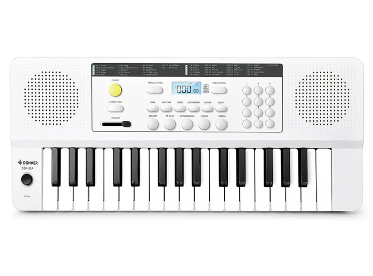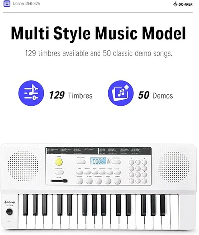 El teclado electrónico portátil Donner DEK-32A tiene 129 timbres disponibles y 50 estudios de repertorio clásico para practicar. La gran capacidad de interpretación y el entretenimiento pueden estimular el talento musical de los principiantes. 【Modo de enseñanza con luz】Cuando abra el modo de acompañamiento de demostración, seleccione las pistas clásicas que desea seguir y tocar, y habrá luces en el teclado. Este modo de práctica puede aumentar el interés de los principiantes y reducir la dificultad de aprendizaje. Los principiantes pueden tocar de inmediato y con facilidad. 【Ligero y portátil】El teclado eléctrico DEK-32A de 32 teclas tiene un espaciado adecuado entre teclas y se puede tocar fácilmente con la fuerza adecuada. No es fácil pillarse las manos durante la práctica. Se puede llevar fácilmente en cualquier momento. 【Diseño más humanizado】El panel de control es más claro y limpio. Con un diseño simple y menos botones, es más fácil tocar. El balancín deslizante puede controlar el cambio de tono y el efecto de deslizamiento resultante también puede aumentar el interés en la práctica del piano.